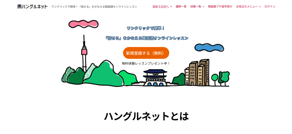 | 特徴 | ハングルネット株式会社は、ワンクリックで始められる韓国語オンラインレッスンをご提供しています。入会金・月会費・年会費はすべて0円、1コマ330円から購入でき、スマホ・PC・タブレットで自宅やカフェから気軽に受講いただけます。講師は全員プロフェッショナルで、日本人スタッフが学習を丁寧にサポートいたします。個人・グループ・動画講座など多彩なレッスンに加え、TOPIK・ハングル検定対策、フリートーク、キッズ向け、BTSスペシャル、4時間で読めるハングルマスターコースなど目的別に選べます。無料体験レッスンも実施中です。韓国旅行中の対面レッスン(ソウル・釜山)や、現地で使えるプチ留学旅行企画もご用意しております。まずは無料登録で「話せる」体験を始めてみませんか。 |
