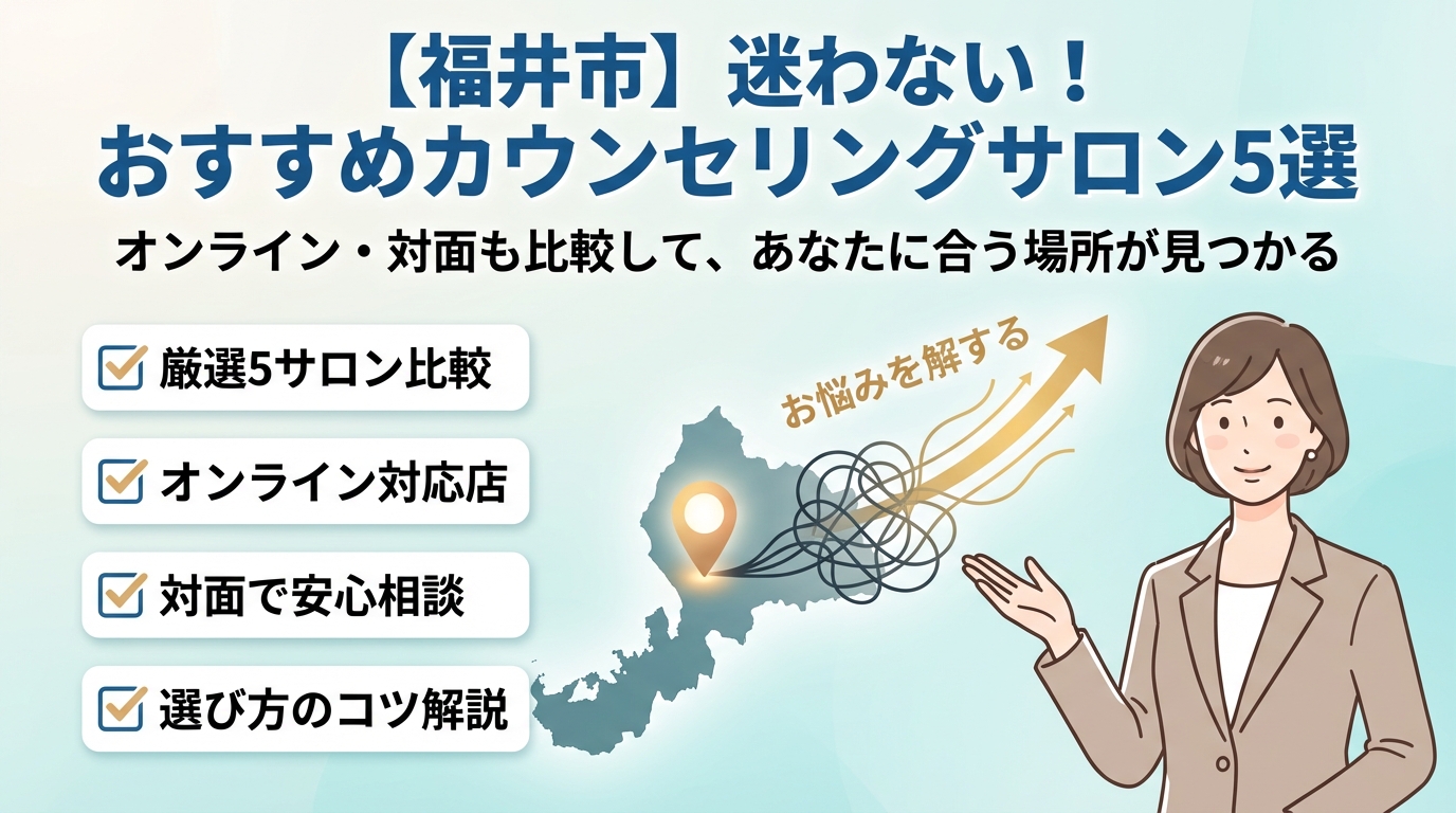 本記事は、福井市で今のモヤモヤを整理したい30〜40代の方に向けて、まず自己チェックで状態を整理し、心理カウンセリングと心療内科と公的なこころの相談の違いを3分で把握し、福井市のカウンセリングルームと心療内科と無料相談を一望できる比較表で見極める流れを用意しました。さらに、カウンセリングが上手いカウンセラーの見抜き方、口コミや料金のどこを確認すべきか、よくある失敗パターンとその回避策、オンラインと対面の選び方まで、実務的な判断材料だけを詰め込んでいます。この記事を読み進めることで、「なんとなく検索して終わる」状態から、福井で自分に本当に合う相談先を一つ選び切るところまで、一気に進められます。