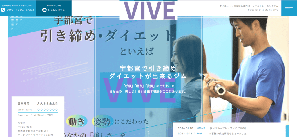 | 特徴 | Personal Diet Studio VIVEは、宇都宮でダイエット・引き締めに特化したパーソナルトレーニングジムです。「呼吸」「動き」「姿勢」にこだわり、あなた本来の美しさを引き出します。経験豊富なトレーナー篠原章人が、真心を込めて目標達成をサポートいたします。パーソナル・ペア・英会話deフィットネス・出張・グループレッスンをご用意し、通いやすい回数券制。4回チケットは25,000円(2026年改定)。体験カウンセリング&トレーニングで最適なプランをご提案いたします。お客様の声でも効果を実感いただいております。営業時間は年中無休9:00〜21:00。所在地は栃木県宇都宮市平松町525 オレンジハイツパート5 102号です。ご予約はメールにて承ります。お待ちしております。 |