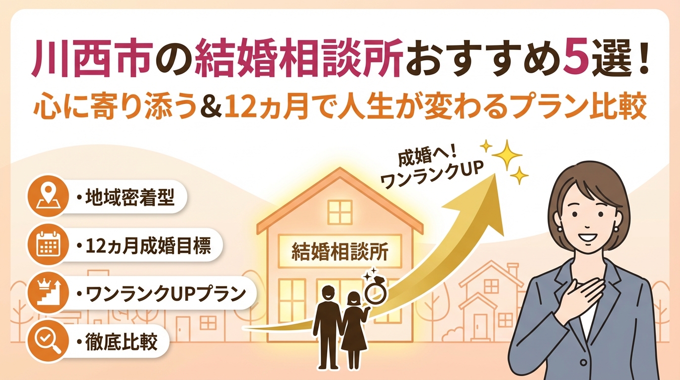 この記事では、川西・宝塚・池田・豊能エリアの相談所を、仲人型かデータマッチング型かといった表面的な違いではなく、面談頻度、オンライン相談、LINE対応、お見合い立ち会い、断り方フォローまで含めた「寄り添い度」で具体的に比較します。そのうえで、料金と成婚率だけで選んで失敗した例、紹介数を絞って一気に流れが変わった例を踏まえ、川西の生活圏で無理なく続けられる12カ月の婚活設計を提示します。
