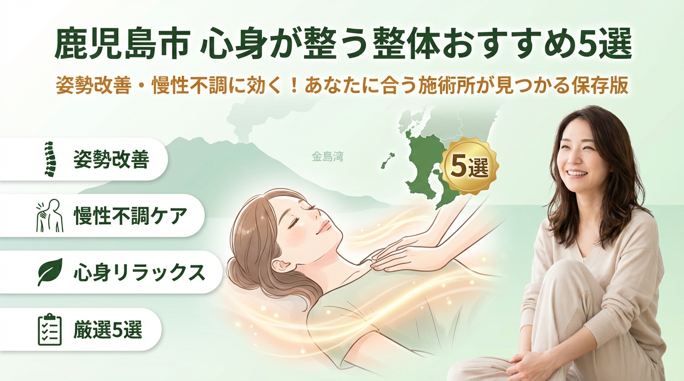 本記事では、整体と整骨、マッサージの違いから、骨盤や背骨の歪みと姿勢・見た目への影響、鹿児島中央駅・鹿児島駅・天文館エリア別の選び方、さらに予約の入れ方やセルフケアまでを一気に整理します。読み終える頃には、「どの院が人気か」ではなく「自分の心身に余白を生むために、どのタイプの施術を、どの頻度と予算で受けるか」が具体的に決められる状態になります。