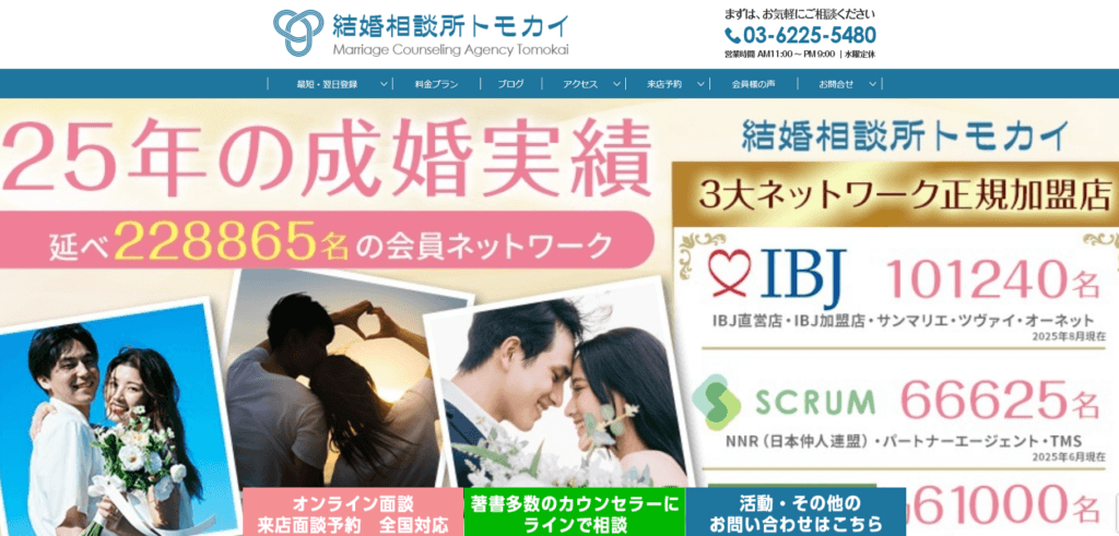 | 特徴 | 結婚相談所トモカイは、IBJ・NNR・BIUをはじめ複数の連盟に正規加盟し、延べ約23万人規模の会員ネットワークからお相手探しができる結婚相談所です。小さな相談所ならではのきめ細やかなサポートと、マッチングアプリ並みの低料金を両立し、無理のない婚活を実現していただけます。代表は仲人専業25年以上、累計5000人以上を対面でカウンセリングしており、その実践的なノウハウは国内外で多数の著書として高く評価されています。入会前にはご希望条件や不安を丁寧にお伺いし、お見合いが難しいと判断した場合には率直にお伝えすることで、納得感のある活動を大切にしています。お見合いから交際、プロポーズ、成婚まで、一人ひとりに合わせた具体的なアドバイスで、成婚率50%以上という高い成果を継続しているのも特徴です。安心・安全な出会いと誠実なサポートで、心から納得できる結婚を一緒に目指してまいります。 |