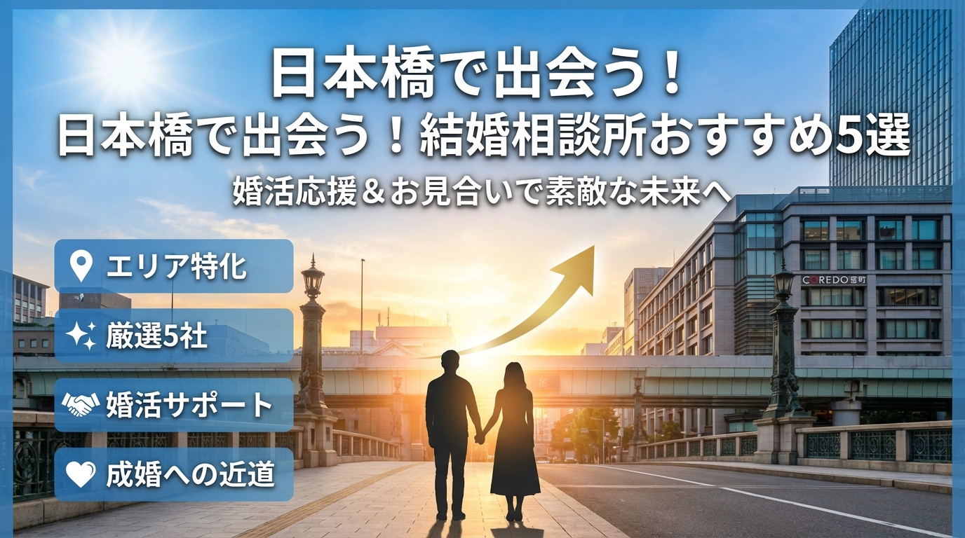 本記事は、「東京都日本橋 出会いを広げる結婚相談所」という視点から、単なる東京の結婚相談所ランキングや料金比較では拾いきれない、日本橋ワーカー特有の事情を分解します。20代から30代・40代の男女別に、日本橋で本当に出会いが広がる条件を、連盟・仲人ネットワーク・婚活パーティー・オンライン型の併用という実務軸で整理します。さらに、ハイクラス男性や30代後半女性がハマりやすい落とし穴、スタッフ本音から見える「ろくな女がいない」「男がやばい」と言われる構造、安い・ランキング上位だけで選ぶリスクまで踏み込みます。最後に、日本橋周辺の具体的な相談所比較と、無料カウンセリングで必ず聞くべき質問リストを提示します。この数分を投資するかどうかで、日本橋での婚活にかける時間と費用の「手残り」が変わります。