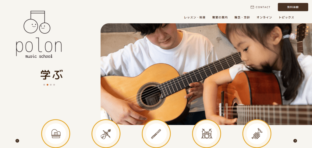 | 特徴 | 福岡県大野城市の音楽教室polon(ぽろん)は、音楽の楽しさに触れながら、一人ひとりの個性に寄り添う丁寧なレッスンを行っています。ギター・ピアノ・ヴァイオリン・フルート・ドラム・トランペットに対応し、初めての方からレベルアップを目指す方まで安心して通っていただけます。リトミックを取り入れ、無理なく自然に基礎力を養えるのも特長です。必要に応じてオンラインレッスン(現在ギター対応)も可能で、続けやすい環境を整えています。無料体験レッスンや楽器の無料貸し出しも実施しておりますので、「どんな教室?先生はどんな人?」と気になる方は、まずはお気軽にご体験ください。発表会やお知らせも随時更新し、学ぶ・楽しむ・奏でる場を広げてまいります。 |