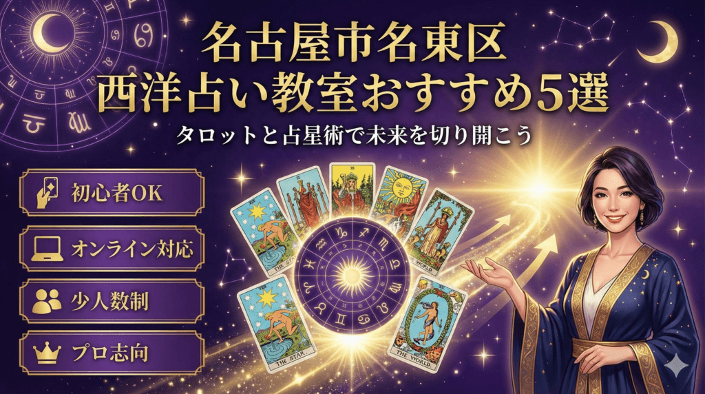 名古屋市名東区で「西洋占いを基礎から学びたい」「体験だけ試して決めたい」と迷っていませんか。星ヶ丘・一社エリアは駅近の教室が多く、平日夜や土日開講の選択肢も広がっています。相場は単発1回5,000円前後、基礎コースは全4〜6回(各90分)が一般的で、教材費や認定料が別途かかる場合があります。まずは条件を見える化して、無理なく通える計画を立てましょう。