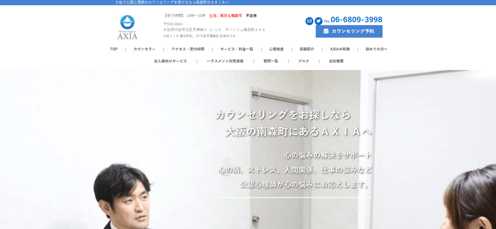 | 特徴 | カウンセリングオフィスAXIAは、大阪・南森町にある公認心理師が在籍するカウンセリングルームです。心の病、不安やストレス、人間関係、仕事、恋愛、家族、子育て、依存症など、さまざまなお悩みに丁寧に対応しています。2008年の開設以来、年間2,000件以上の相談実績を重ね、精神科・心療内科に通院中の方のご相談にも対応してまいりました。面談カウンセリングに加え、Zoomや電話などオンラインでのご相談も可能です。親子・夫婦・カップルなど複数でのご利用や、女性カウンセラーへのご相談も承っております。料金体系は明確で、ホームページに掲載している料金以外をいただくことはありません。南森町駅・大阪天満宮駅から徒歩約3分とアクセスしやすく、土日祝もご相談いただけます。一人で抱え込まず、お気軽にご相談ください。 |