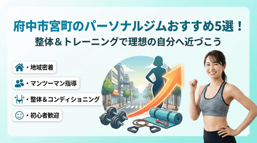 府中駅周辺で「結局どのパーソナルジムが自分に合うの?」と迷っていませんか。仕事帰りに寄れるか、初心者でも続くか、料金は総額でいくらか——判断材料がバラバラで比較しづらいのが本音ですよね。東京都府中市宮町エリアは駅徒歩5〜10分圏にジムが集まり、回数券・月額・通い放題まで選択肢が増えています。
