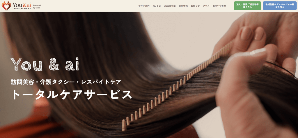 | 特徴 | You&aiは、「美容」と「介護」を通じて、心とからだに寄り添うトータルケアサービスをお届けしています。ご自宅や施設へ伺う訪問美容・介護美容では、衛生管理を徹底し、ケアマネージャー様と連携しながら安心・安全な施術を行います。通院や外出をサポートする介護タクシーでは、車いす対応の福祉車両で送迎から付き添いまで丁寧に対応いたします。また、ご家族の負担を軽減するレスパイトケアや、触れ合いとコミュニケーションで心をほぐすソシオエステ、ヨガ・書道・スマホ教室などのカルチャーコミュニケーションを通じ、地域の学びと交流の場も提供しております。美容室Classでの髪質改善メニューも含め、年齢やご状態にかかわらず、「その人らしさ」を大切にしたサービスで、毎日の生活に笑顔と安らぎをお届けいたします。 |