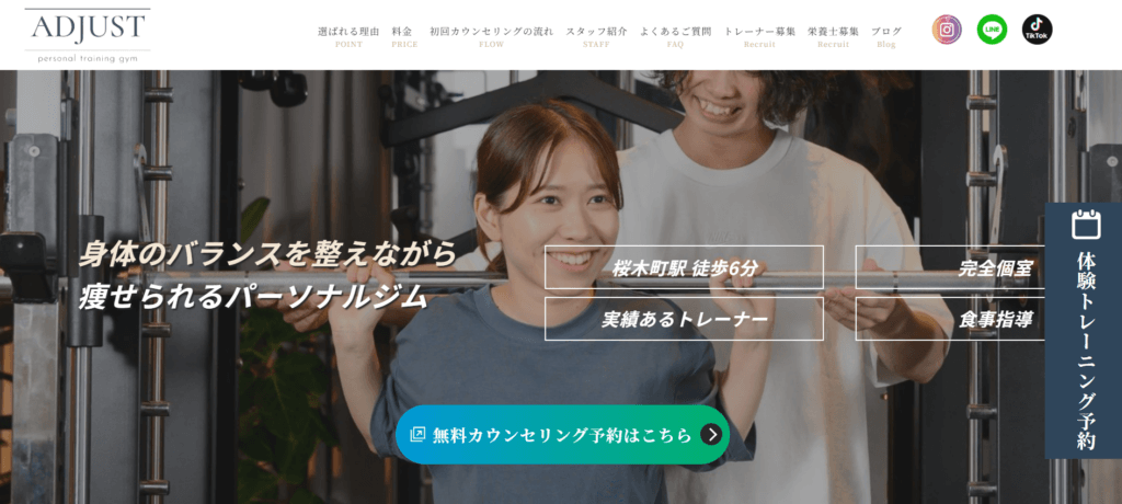 | 特徴 | 横浜・桜木町のパーソナルジムADJUST(アジャスト)は、ただ痩せるだけではなく肩こり・腰痛など不調改善にも対応するパーソナルジムです。 桜木町駅から徒歩6分日ノ出町駅から徒歩1分とアクセス良好で、横浜駅やみなとみらいエリアからも通いやすい立地。 女性会員が多く在籍しており、ウェア・シューズ・タオル・プロテイン・水を無料完備しているので手ぶらで通えるのが特徴となっております。 桜木町で通いやすく、健康と美しさを両立できるパーソナルジムです。 |
