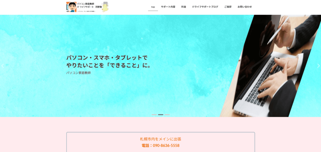 | 特徴 | パソコン家庭教師・ITライフサポート 河野塾は、札幌市内を中心に出張専門で、パソコン・スマホ・タブレットの個別指導と各種サポートを行っています。ご自宅やオフィス、集会室やカフェなど、ご希望の場所でマンツーマンまたは少人数の講習に対応いたします。文書作成や表計算、プレゼン資料、画像・動画編集、ホームページ作成など、やりたいことを「できること」にするお手伝いをいたします。あわせて、初期設定、定期メンテナンス、不具合調査、ネットワーク設定、周辺機器接続、トラブル解消、ホームネットワーク機器設定、各種ファイルの作成・編集、簡易なWeb制作・更新まで、ITライフをトータルにサポートします。月単位のご利用はもちろん、1回のみのご依頼も歓迎です。できることをできる限り全力で対応いたします。出張専門でご指導やお困りごとがございましたらぜひお問い合わせください。 |