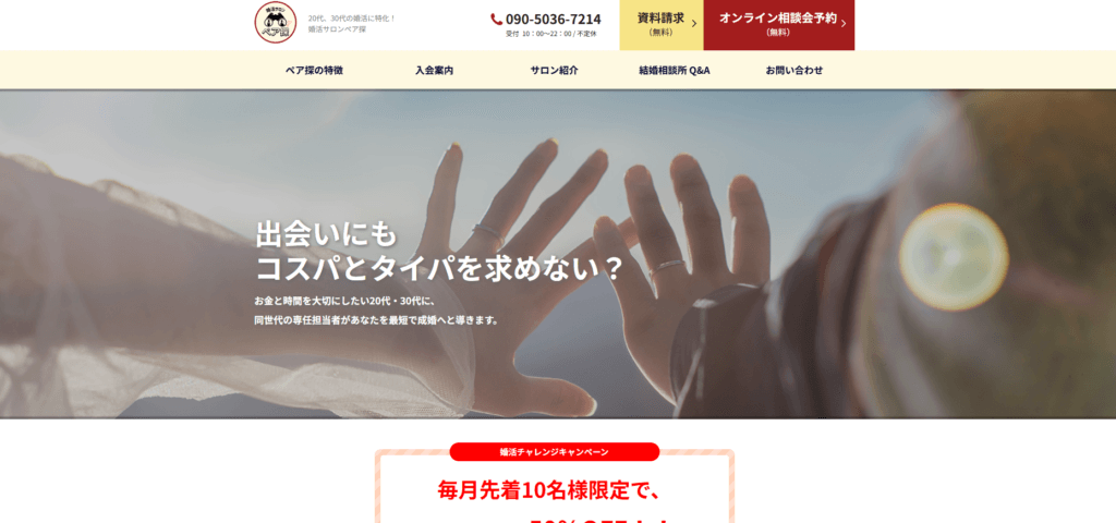 | 特徴 | 婚活サロンペア探(ペアタン)は、20代・30代の婚活に特化した結婚相談所です。真剣に結婚を希望する独身男女が会員登録し、プロの仲人によるサポートを受けながら成婚(婚約)を目指すサービスとして、多くのご縁をつないでいます。 お金と時間を大切にしたい忙しい世代のために、「コスパ」と「タイパ」を重視した婚活スタイルをご提供。同世代の20代専任担当者が、恋愛観や仕事、将来への不安など、リアルな悩みに寄り添いながら、友人のような話しやすさで丁寧にサポートいたします。 また、独身証明書や年収証明など各種証明書の提出を必須としているため、身元が確かな会員様のみが活動されています。安心できる環境の中で、効率的に理想のお相手探しを進めていただけます。マッチングアプリ等と比較すると費用は高めですが、その分、お見合いのセッティングからデートの悩み相談、交際中のサポートまで、きめ細やかな支援を受けられる点が大きな特長です。 さらに、全国の会員様とつながるシステムとAIを活用し、理想のお相手との出会いをスムーズに実現。転職や転勤、Uターンなどライフスタイルが変化しやすい時期でも、出会いのチャンスを逃さず活動できる環境を整えております。 無料の資料請求やオンライン相談会も実施しておりますので、「そろそろ真剣に結婚を考えたい」と思われたタイミングで、ぜひ一度ペア探にご相談ください。あなたの大切な一歩を、私たちが全力で応援いたします。 |