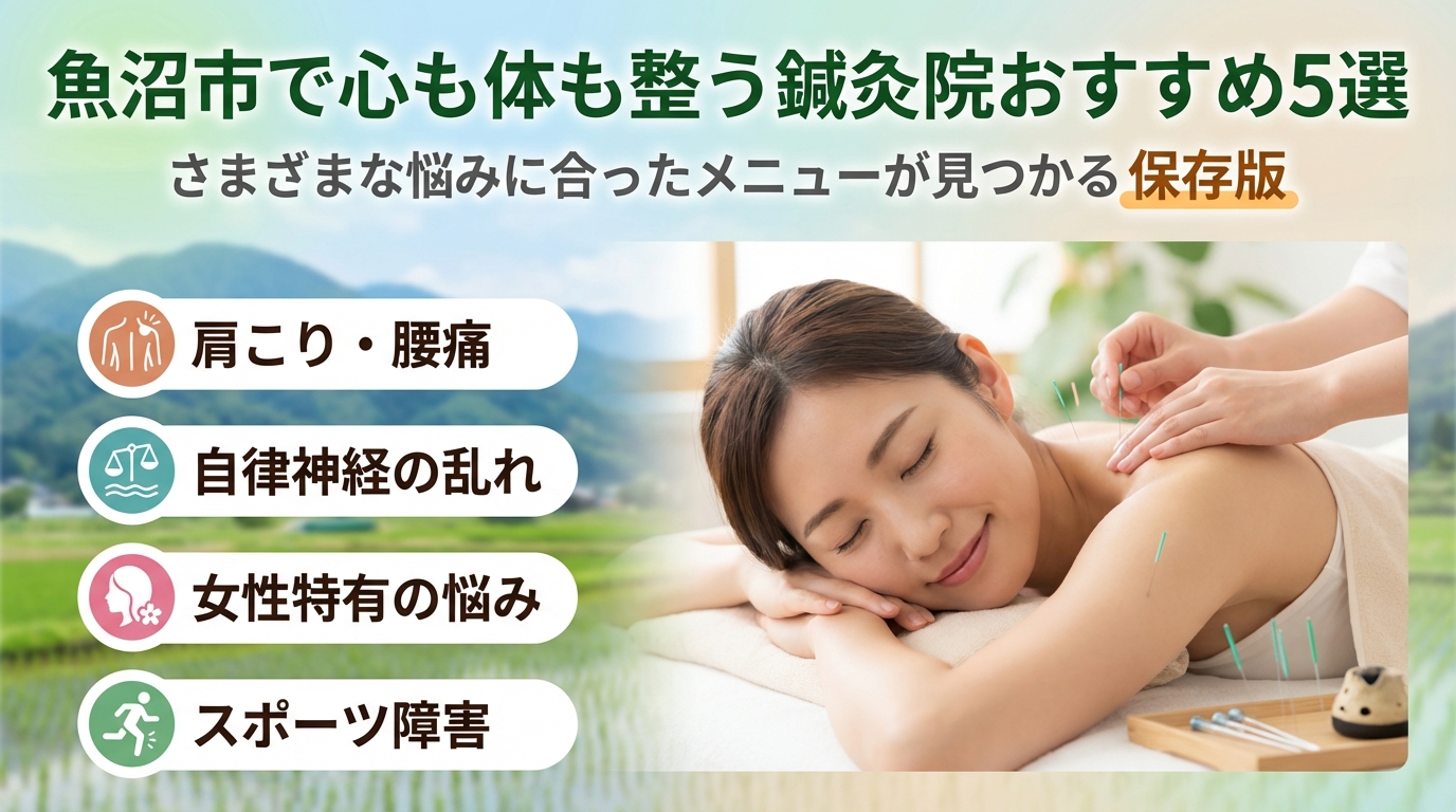 本記事は「魚沼市 心も体も整える鍼灸院」というテーマで、雪かきや長時間運転、介護疲れなど魚沼特有の生活背景と、自律神経失調症や更年期、不妊、慢性の肩こり・腰痛、頭痛との関係を整理します。そのうえで、東洋医学系鍼灸、骨盤矯正サロン、神経系整体、訪問・保険適用マッサージといった治療院タイプを、悩み別に比較しながらマッチングできるように設計しました。さらに、鍼治療をやらない方がいい人、禁忌疾患、何回くらいで変化が出るか、保険適用の現実まで、魚沼の生活目線で整理しています。