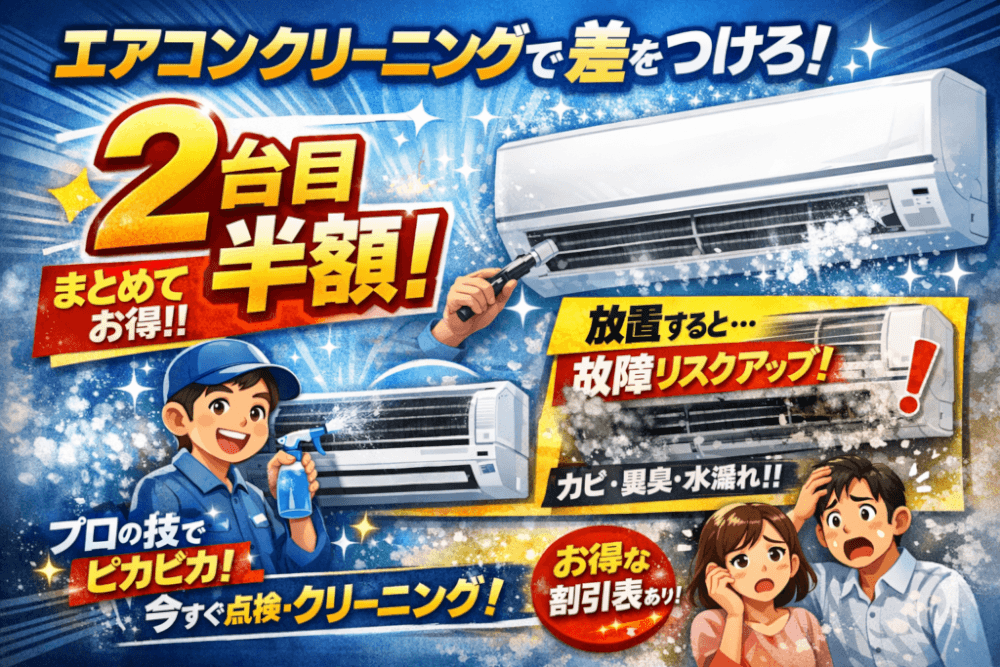 「最大◯◯%OFF!」の大きなバナーを見て、“今年こそ2台まとめてエアコンクリーニングだ!”とテンションが上がる瞬間こそ、一番冷静さが試されます。現場感覚で言うと、2台目割引の問い合わせのうち、体感半分以上が「実は割引対象外」になっていて、その多くがLP(ランディングページ)の読み方ミスです。