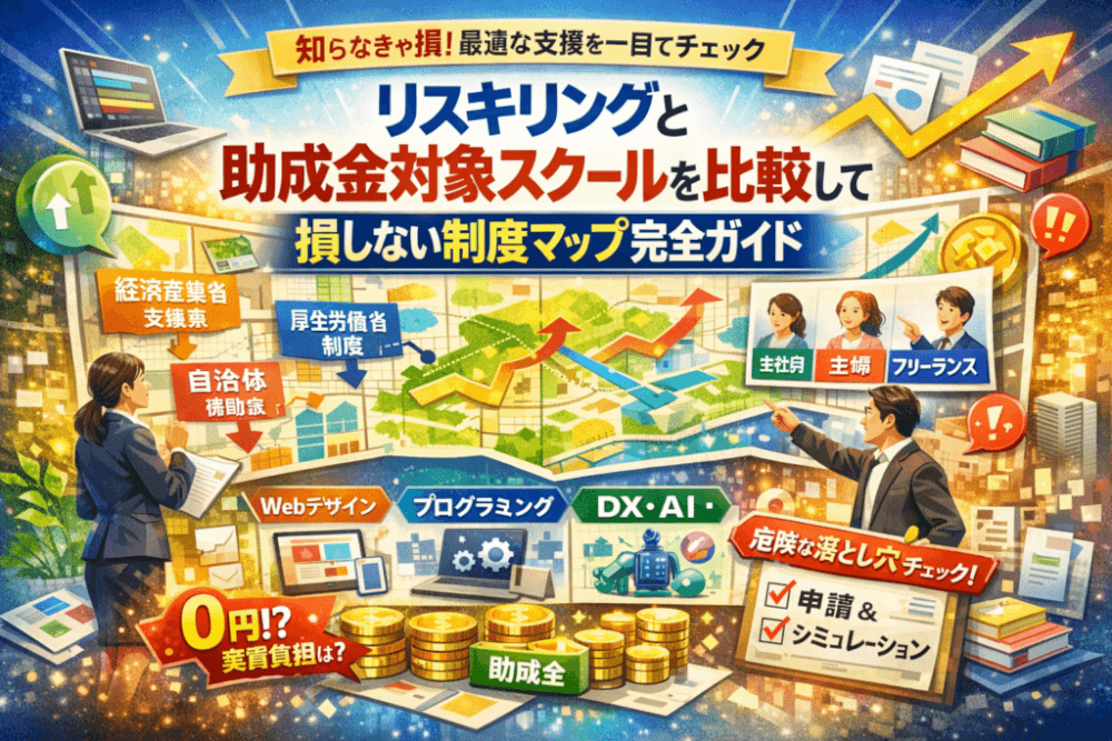 本記事では、経済産業省と厚生労働省、自治体のリスキリング支援を1枚の制度マップとして整理し、個人向け支援事業と教育訓練給付金、人材開発支援助成金のどれを狙うべきかを、会社員・主婦・フリーランス・法人別に明確に切り分けます。そのうえで、デジハリやSHElikes、HerTech、Find meなどのスクールを、Webデザイン、プログラミング、DX・AIといった分野別に比較し、「どの講座で、いくらまで公的支援が入り、最終的にいくら自腹になるのか」を数字でシミュレーションします。
