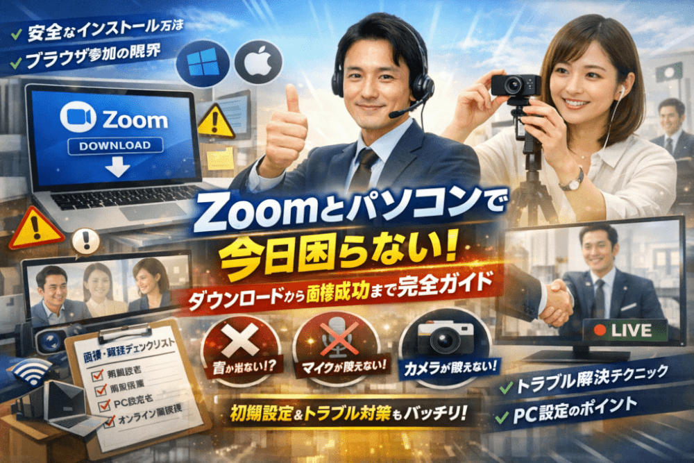 コロナ以降、オンライン面接や商談、Zoom相談会の設計を企業と一緒に組む機会が一気に増えました。その現場で何度も痛感したのが、Zoomアプリの使い方以前に、パソコン側の準備不足だけで面接の評価や商談の成約率が下がってしまう現実です。名前が「iPhone」のまま入室して担当者に覚えてもらえなかった学生、古いノートパソコンと不安定なWi-Fiで声が途切れ、良い提案をしているのに信頼感を落としてしまった中小企業の経営者もいました。私自身も、初期のオンライン商談でマイク設定を誤り、開始数分ほぼ無音のまま時間を失った悔しい経験があります。こうした場面では、難しいIT知識ではなく、ダウンロード元の確認、初期設定、当日のチェックリストといったごく基本の積み重ねが結果を左右します。本記事では、日々中小企業の集客やオンライン商談を支援する立場から、今日の面接や商談で困らないために、経営者や就活生が自分で再現できる形にまで落とし込んでまとめました。Zoomを「なんとなく使うツール」ではなく、「信頼を生む武器」として使い切ってほしい、という思いで書いています。
