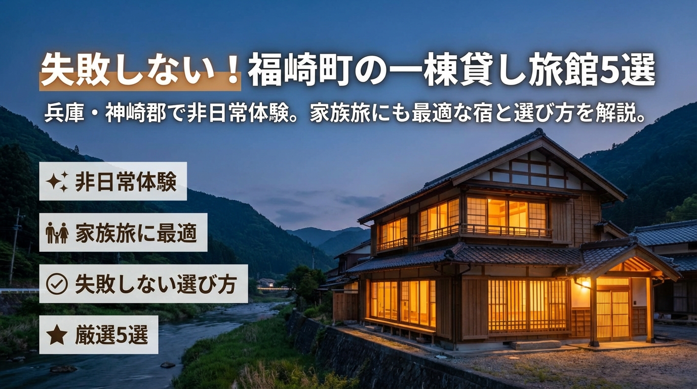 「日本一の宿」はランキングや旅行サイトの評価軸によって毎年変わるため一概には言えませんが、この記事『神崎郡福崎町で非日常を過ごす一棟貸し旅館おすすめ5選!兵庫家族旅にも最適、本当に失敗しない選び方はどこがいい?』では、「点数としての日本一」よりも「自分たちの旅の目的に対して、日本一の思い出になる宿」を選ぶことを重視しています。具体的には、NIPPONIA播磨福崎蔵書の館のように江戸の蔵と本に囲まれた静かな一棟貸し古民家や、ラドーレ神河・新田ふるさと村・ホテルモンテローザ・リラクシアなど、福崎町・神河町エリアの一棟貸し旅館やコテージを、アクセス・水回り・サウナ・BBQ設備・定員と「快適人数」・田舎ならではの騒音や花火ルールまで踏まえて比較し、「あなたにとっての日本一」を見つけるための選び方ガイドとして構成しています。