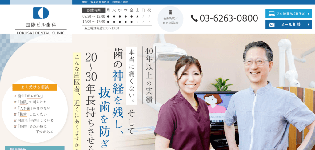 特徴国際ビル歯科のホームページをご覧いただきありがとうございます。当院は銀座駅・銀座一丁目駅から徒歩3分、有楽町・日比谷からも通いやすい総合歯科クリニックです。虫歯や歯周病治療はもちろん、抜歯や再発を防ぐマイクロスコープ根管治療、インプラント、入れ歯、審美セラミック、矯正歯科、親知らずの抜歯、歯科ドックまで幅広く対応しております。 「短期集中治療」や、寝ている間に治療が終わる「睡眠無痛治療(静脈内鎮静法)」にも対応しており、歯科恐怖症の方やお忙しい方にも安心して通っていただけます。また、40種類の精密検査とCT・マイクロスコープなどの精密機器、院内常駐の歯科技工士との連携により、一人ひとりに合わせたオーダーメイド治療を行っています。 「ボロボロの歯」「他院で断られた」「入れ歯が合わない」「抜歯は避けたい」など、難しいケースのご相談も多く、セカンドオピニオンにも力を入れております。まずは丁寧なカウンセリングで、お悩みやご希望をじっくり伺い、「一生自分の歯で噛めること」を目指した原因療法と予防で、生涯にわたるお口の健康をサポートいたします。歯のお悩みは、どうぞお気軽にご相談ください。