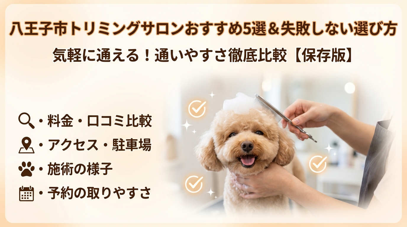 この記事では、八王子市のトリミング相場とエリア別の通いやすさ、激安クーポンや口コミ頼みで起きがちな失敗、代表的な5店舗の向き不向き、比較表による「安い近いだけでは分からない違い」、さらにペットホテルや飼い主トリミング教室まで含めて整理します。読み終えるころには、「自分の生活動線と愛犬の性格に本当に合うサロンがどこか」を1店まで絞り込める状態になっているはずです。