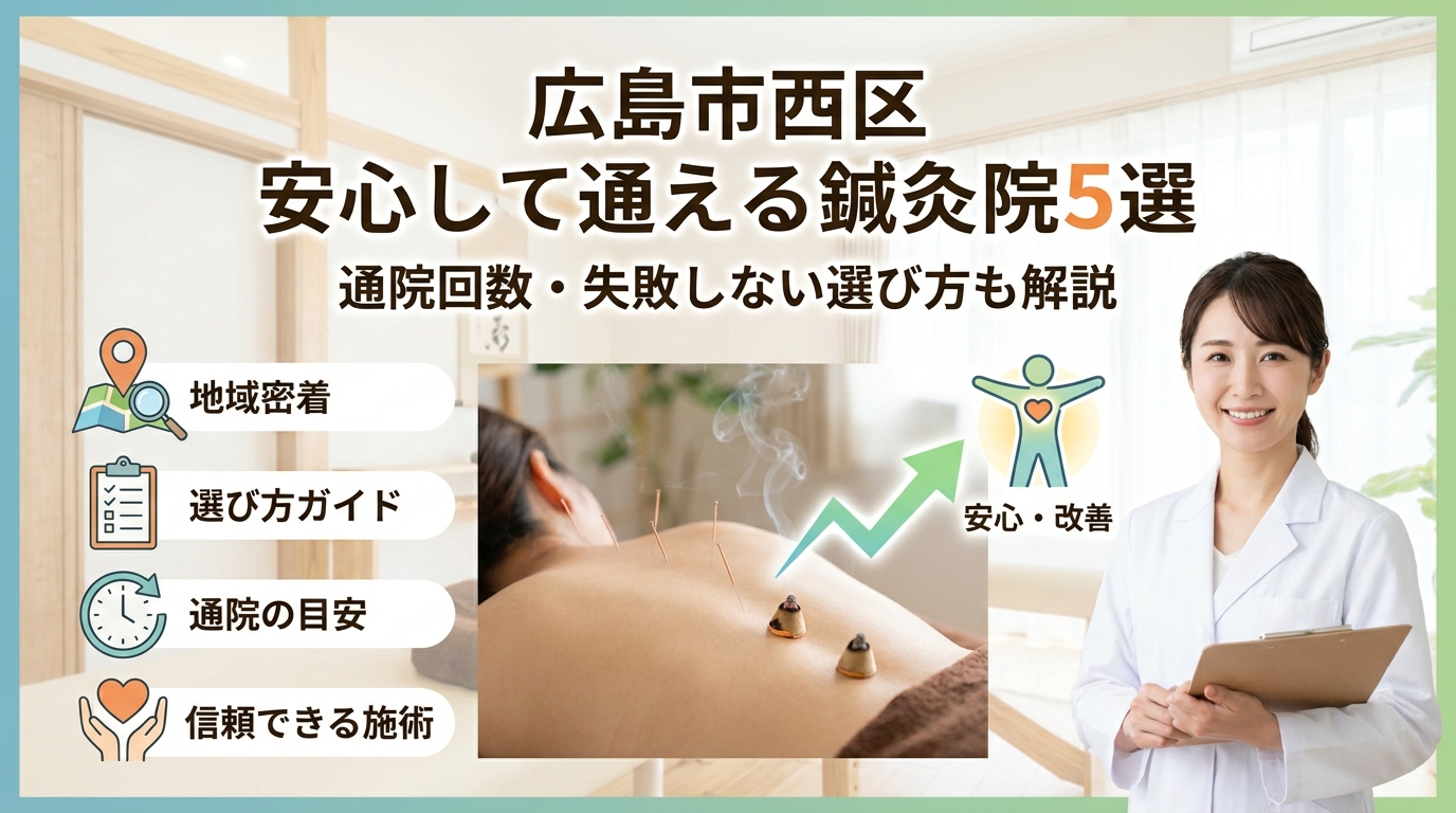 本記事では、広島市西区エリアで鍼灸や整体、整骨、マッサージサロンを選ぶ際に、どの院が自分に本当に合うのかを数字と宣伝の外側から見抜く方法を整理します。肩こりや頭痛、腰痛、不妊、自律神経、美容など症状別に「現実的な通院回数」と治療の進み方を示し、西広島・横川・草津・己斐・観音といった周辺エリアの治安や夜の通院リスクも踏まえて、通いやすさを実務レベルで検証します。