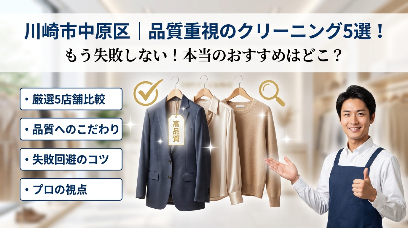 クリーニング代は毎回払っているのに、本当に服の価値を守れているかどうかを確認せずに済ませてしまうと、縮みやテカリ、シミ残りという「目に見える損失」を繰り返します。川崎市中原区、特に武蔵小杉・新丸子・武蔵中原はホワイト急便やポニークリーニング、ホームドライ、マミークリーニングに加え、地域密着店や宅配クリーニングまで選択肢が多く、料金や口コミだけを追っても品質にこだわる衣類クリーニングにはたどり着きません。技術力のある個人店も、高級ダウン対応の宅配クリーニングも、強みと弱点がはっきり分かれており、「どこが安いか」ではなく「どこに、どんな衣類を出すか」を決める軸がないと失敗します。この記事では、国民生活センターが示す典型トラブルを踏まえながら、中原区の実在店舗とラクリや白洋舍など宅配サービスを同じ物差しで比較し、クリーニング師やシミ抜き、保管サービス、即日仕上げの裏側までプロの視点で分解します。そのうえで、共働きファミリーとスーツ多用ビジネスパーソンそれぞれに最適な「店舗と宅配の使い分けルート」と、タグ確認やスマホ撮影など今すぐできるチェック法まで具体化しました。「おすすめ5選」やランキングだけでは絶対に見えない、川崎市中原区で失敗しない衣類クリーニング選びの実務マニュアルとして活用してください。