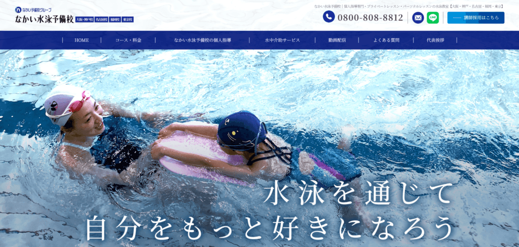 特徴なかい水泳予備校は、「泳ぎたい」と願うすべての人のための水泳個人指導専門スクールです。お子さまから成人の方まで、初心者の水慣れから競泳のタイムアップまで、一人ひとりの目的に合わせたプライベートレッスンを行っています。大阪・神戸・名古屋・福岡・東京エリアのプールで受講いただけ、指導経験と社会人経験を備えた講師が出張してレッスンを担当いたします。発達障がい・知的障がい・なかい水泳予備校では、水泳の個人レッスン・個人指導を行っています。