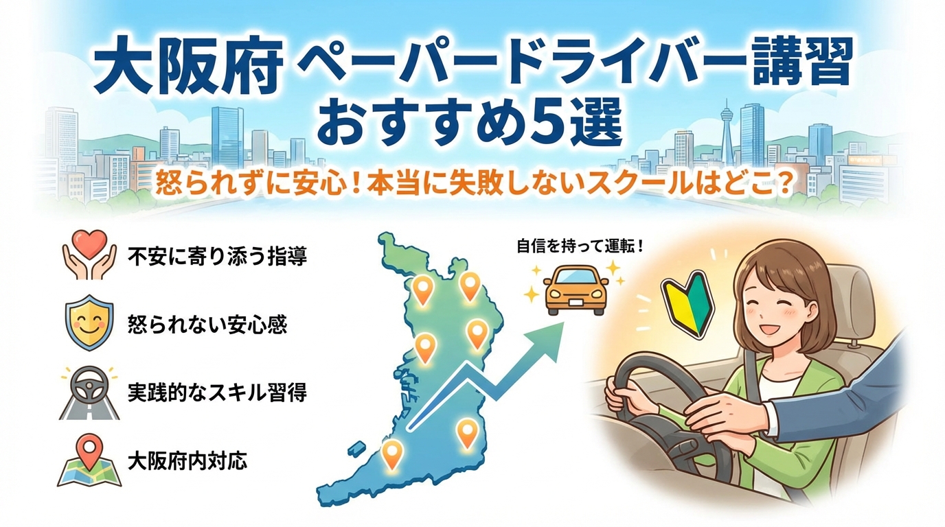 大阪府のペーパードライバー講習の相場は、教習所(通学型)ではおおよそ2時間あたり1.5万〜2万円前後、出張ペーパードライバースクールでは2時間あたり1.2万〜1.8万円前後が目安です。複数回コース(2時間×3〜5回など)になると、トータル3万〜8万円ほどの幅があり、マイカー練習の可否やインストラクター指名、土日料金、キャンペーン割引の有無で変動します。本記事では、「不安に寄り添う」と掲げる大阪府内の教習所と出張スクール5社をピックアップし、料金表の見方やキャンペーン価格の落とし穴、追加料金が発生しやすいポイントまで比較して解説しています。