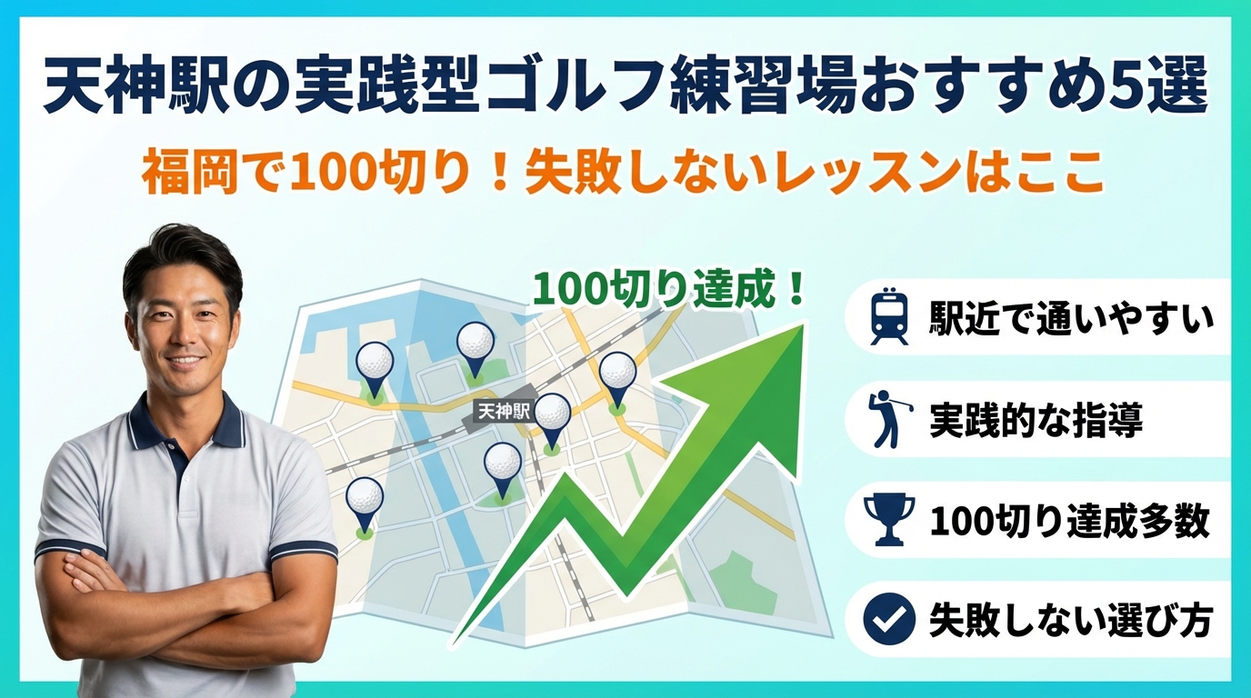 仕事帰りに天神駅周辺のインドアで練習しているのに、スコアは120〜100台で頭打ちのまま。この状態が続く最大の理由は、「天神駅 実践的に鍛えるゴルフ練習場」を立地と料金だけで選んでいることにあります。GOLFTEC天神やミズノゴルフスタジオ天神、sakuttoGOLF福岡天神、NPゴルフスタジオ、ウエストサイドゴルフといった有名スタジオはどこも一見魅力的ですが、どれを選んでも同じではありません。実際に100切りや接待ゴルフで「恥ずかしくないスコア」に近づけるかどうかは、スイング解析の精度、シミュレーションゴルフの使い方、ラウンドレッスン設計、そして予約の取りやすさまで含めた実戦力アップの仕組みで決まります。この記事では、天神・博多エリアの主要インドア施設を、設備とマンツーマンレッスン/通い放題プランの中身、継続しやすさの観点から横並びで比較し、「あなたの現状スコアと目的」に最短距離で合う選び方だけを抽出します。打ちっぱなしとインドアの賢い併用法や、体験レッスン前に投げるべき質問リストまで具体化していますので、ここで軸を決めずにスクール選びを進めること自体が、時間と会費の目減りにつながります。