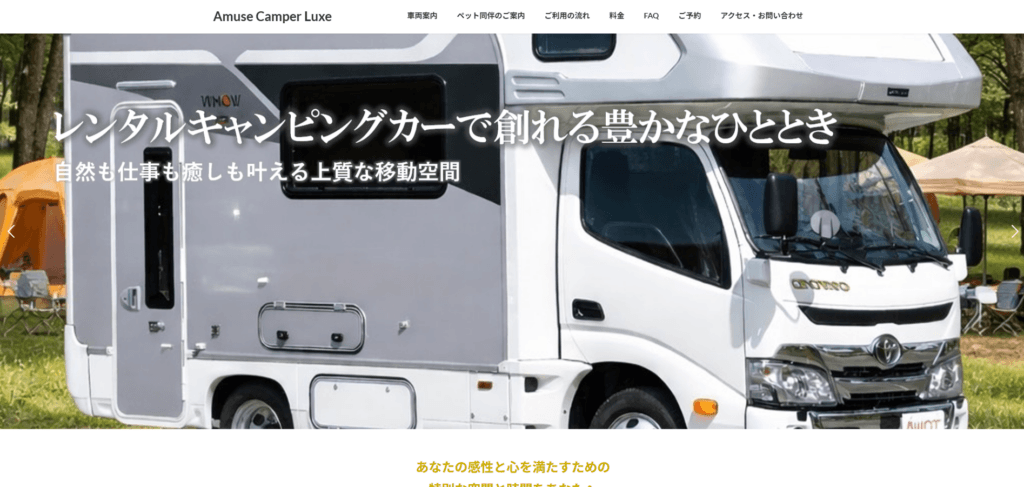| メニュー | レンタカー業務 レンタルから始まる豊かな人生を創出する入口として Amuse Camper Luxeはキャンピングカーのレンタル事業をご提供しています 自然も、美しさも、安心も、優しさも、何ひとつ誰ひとり置いていかない”perfect Time”として愛犬、ご家族と叶える非日常のラグジュアリーをレンタルというスマートチョイスでご体験いただくことが可能です |