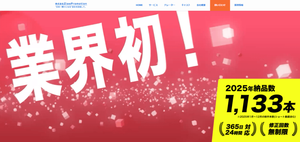 | 特徴 | 株式会社ZiasPromotionは、WEB CMやYouTube動画、ショート動画を中心に、企画から撮影・編集・納品までワンストップで対応する映像制作会社です。私たちは「日本一頼りになる会社になること」をミッションに、低価格でありながらテレビ業界出身のプロが手がける高品質な映像をご提供いたします。修正回数は無制限、24時間365日体制で、急なご依頼や深夜撮影にも柔軟に対応いたします。商品・サービス紹介、会社紹介など、お客さまの目的に合わせた最適な企画を立案し、ターゲットに響くキャストやナレーター、スタジオの手配まで一括サポートいたします。貴社の魅力を最大限に引き出し、事業成長の架け橋となる動画制作を、誠心誠意お手伝いいたします。また、広告代理店さまとの協業や、YouTubeチャンネル運用代行など、継続的なマーケティング支援も行っております。初めて動画制作をされる方にも安心してお任せいただけるよう、丁寧なヒアリングと明瞭な料金プランで進行いたします。どのようなことでも、まずはお気軽にご相談ください。映像の力でブランド価値を高め、売上向上や採用強化につながる成果重視のクリエイティブをご提供いたします。今後も進化を続けてまいります。 |